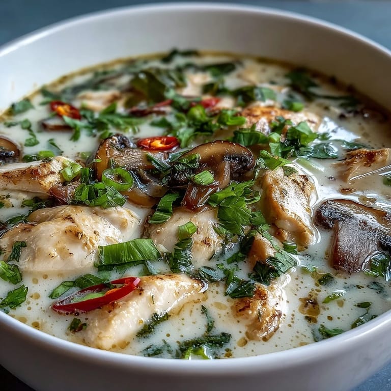 Pin it My first real encounter with Tom Kha Gai happened on a rainy Bangkok evening at a small shophouse restaurant, where the soup arrived in a steaming bowl that seemed to glow with golden coconut cream. The aroma alone—lemongrass cutting through creamy richness, lime leaves whispering something herbaceous and bright—made me understand why this soup had traveled so far beyond Thailand's borders. Years later, I'd recreate that bowl in my own kitchen, chasing that exact balance of tangy, sweet, and savory that makes you want to keep sipping long after the chicken is gone.