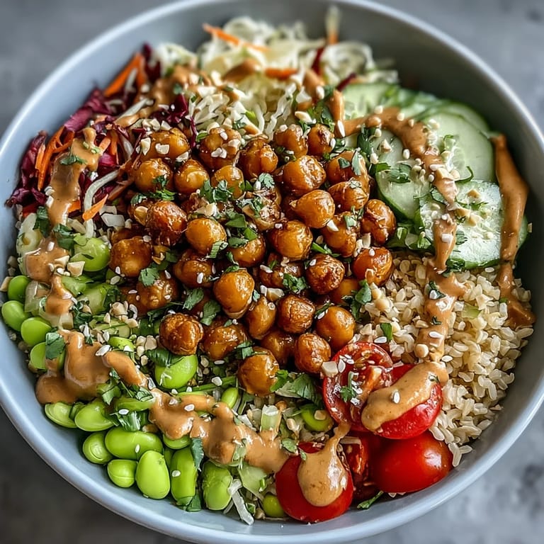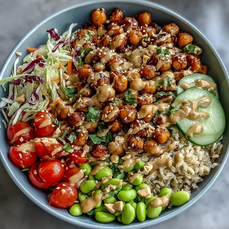 Pin it Last Tuesday, I was scrolling through my phone during lunch when a coworker mentioned she'd been eating the same sad desk salad for weeks. That afternoon, I threw together a peanut chickpea bowl at home just to see what the fuss was about, and suddenly I understood why people get excited about lunch. The roasted chickpeas hit that sweet spot between crunchy and tender, the peanut sauce smelled like a Thai takeout place had set up shop in my kitchen, and somehow all these simple vegetables felt like they belonged together.