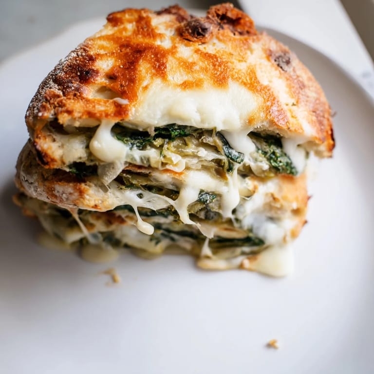 Pin it My neighbor knocked on the door one rainy afternoon with a jar of marinated artichokes and a bag of spinach from her garden. I had sourdough going stale on the counter and a block of mozzarella in the fridge. What started as pantry improvisation turned into something I now crave on cold evenings. The creaminess of the filling against the crisp, buttery bread makes every bite feel indulgent without any fuss.